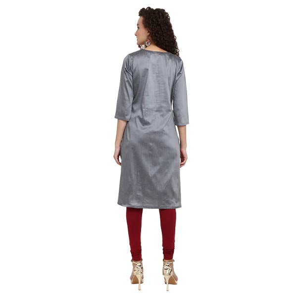customize your wardrobe with this refreshing styles, like this grey, knee-length women's kurta. this is made in poly silk fabric and highlighted with a round neck and three-fourth sleeves. team it with any palazzos, secret pants or leggings of your choice.