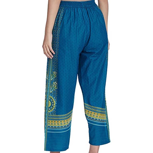 Loose fit ankle length sapphire blue palazzo pants in mid-rise with geometric print.