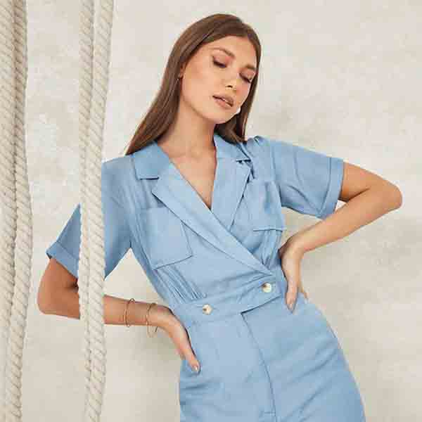 Blue solid basic jumpsuit ,has a shirt collar, short sleeves, na pockets