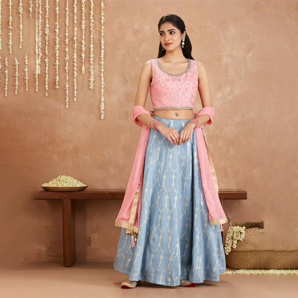 Gajra Gang by Fashion Bani Pink and Blue Crop Top With Skirt and Dupatta